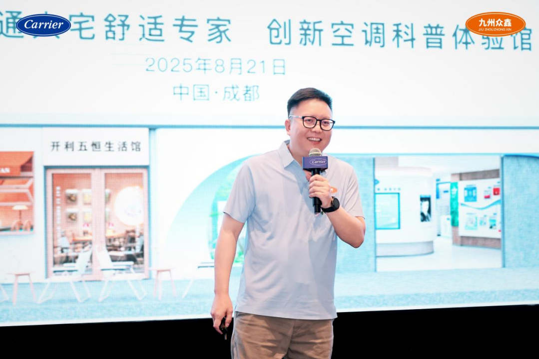 作為東道主,九州眾鑫集團董事長王連鋒先生以一位深耕行業多年的“老兵”視角,分享了其逆勢投入的思考與信念。在開利空調123周年的歷史性時刻,他選擇在成都打造這樣一個空調科普體驗館,以期為行業與社會創造長期價值。他特別感謝開利集團及各品牌方的支持,并表示九州始終秉持長期主義,致力于為美好生活而奮斗。他堅信“危險中有機遇”,將攜手團隊勇于創新、堅定前行,持續為行業與社會貢獻力量。