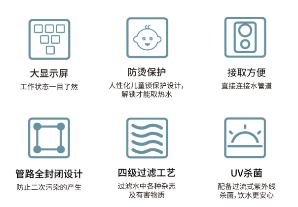 除此之外,此款商務直飲機還采用了整機管路全封閉設計,可從入水、儲水到出水整個環節,有效減少細菌的滋生,進一步防止二次污染的產生。以及人性化的兒童鎖保護設計,防燙保護,必須解鎖才能取熱水;燈光顯示水溫,防止誤操作,出水溫度實時監測。一目了然,操作透明簡潔。