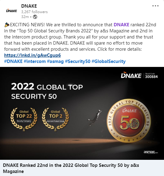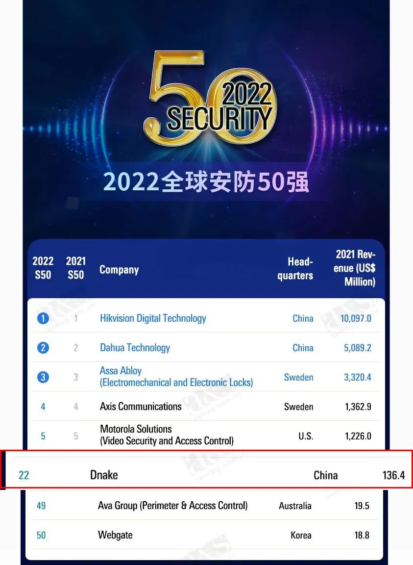 狄耐克位居a&s全球安防50榜單第22位!