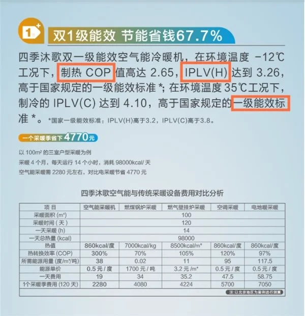 以100㎡的三室戶型采暖為例,采暖4個月,每天運行14個小時,消耗98000kcal/天,采用達到并超過國家一級能效,制熱COP達到2.65、IPLV(H)達到3.26的四季沐歌空氣能冷暖機采暖,則僅需2280元,對比傳統的空調等采暖方式可節省4770元,是主流采暖方式中最省錢的。