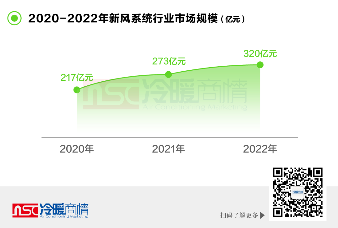 據(jù)冷暖商情不完全統(tǒng)計,2022年中國新風(fēng)市場銷售規(guī)模持續(xù)增長,約為320億元。其中,住宅領(lǐng)域、教育領(lǐng)域、舒適家居領(lǐng)域、醫(yī)療領(lǐng)域、公共領(lǐng)域等五大細(xì)分市場增長明顯。
