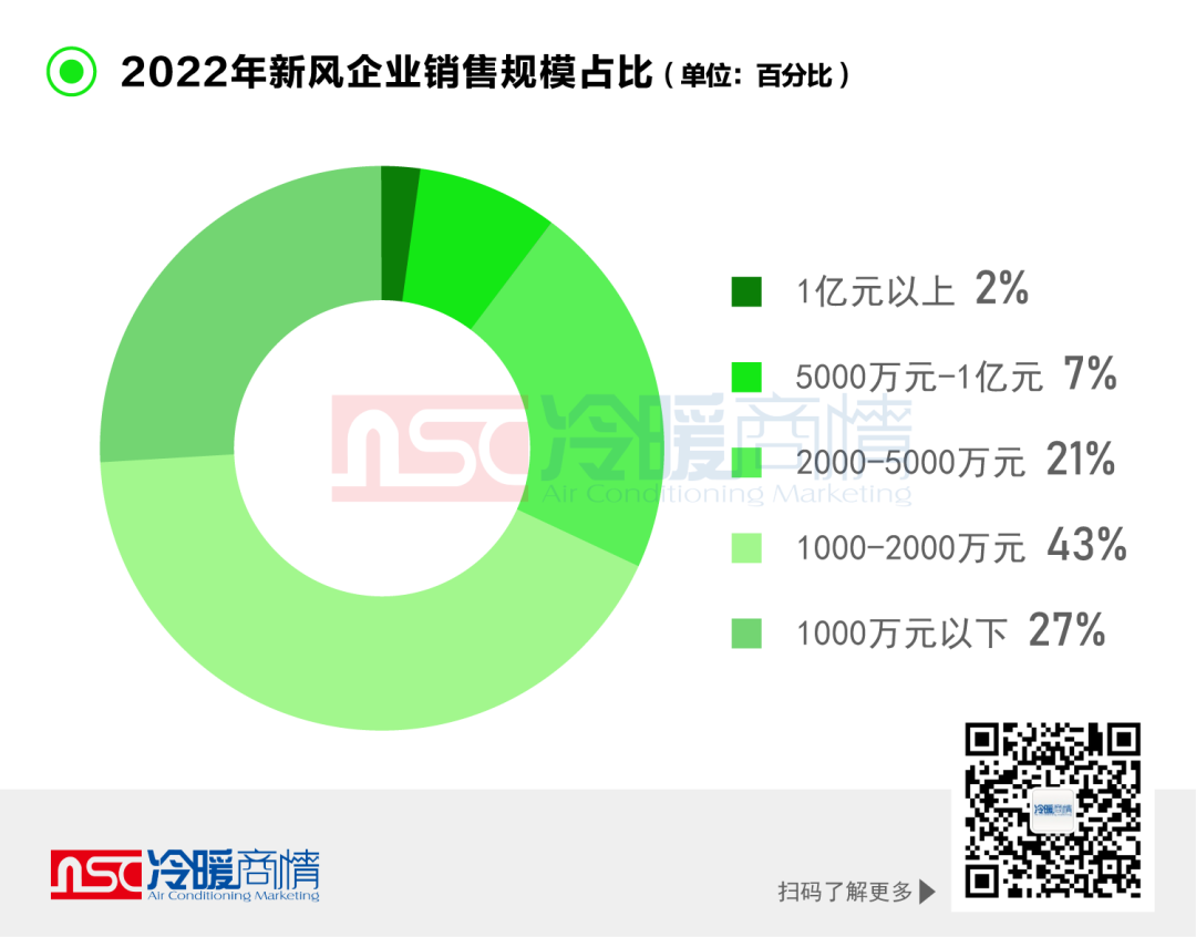 據(jù)冷暖商情統(tǒng)計,目前國內(nèi)共有600余家新風(fēng)企業(yè),在這些企業(yè)中,2022年銷售額突破1億大關(guān)的品牌僅占總數(shù)的2%,銷量在5000萬元到1億元的品牌占比7%,2000萬-5000萬元的品牌占比為21%,1000萬元-2000萬元的品牌占比43%,1000萬元以下品牌則占比27%。