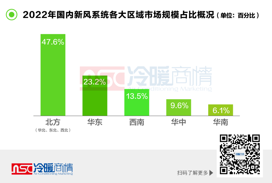 在華南地區(qū),由于年溫差小、濕度較大,新風(fēng)系統(tǒng)市場尚未得到很好的開發(fā),但目前也吸引了一眾新風(fēng)企業(yè)駐足開發(fā)其潛力空間,規(guī)模占比6.1%。