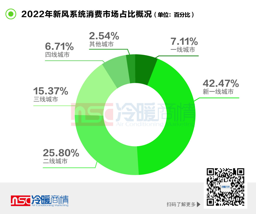 目前,新風(fēng)系統(tǒng)消費(fèi)市場主要集中于新一線城市與重點二線城市,2022年新一線城市住宅新風(fēng)系統(tǒng)市場規(guī)模占比42.47%,二線城市市場規(guī)模占比25.80%。