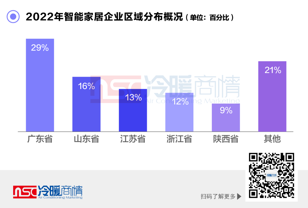 我國智能家居行業企業數量較多,從區域分布來看,企業數量最多的地區為廣東省,其次為山東、江蘇、浙江、陜西等,東南部地區整體分布更為集中。