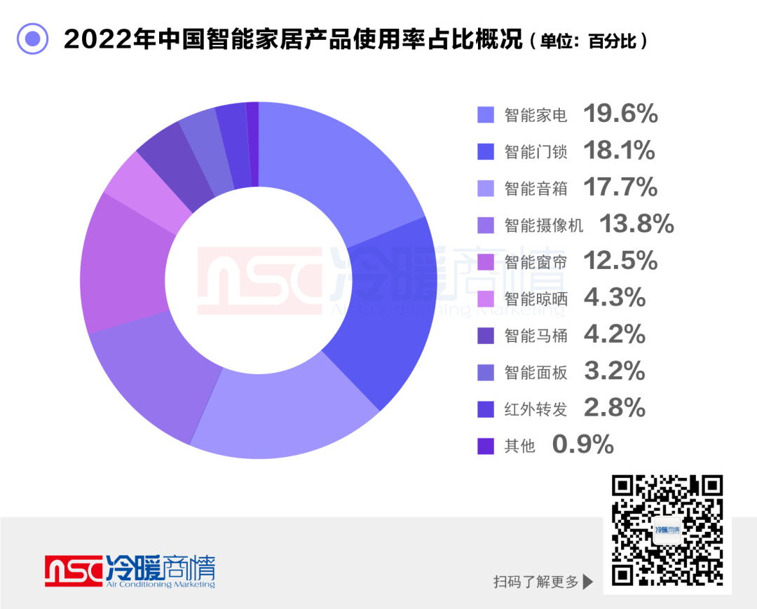 從細分市場來看,智能家電、智能門鎖、智能窗簾、智能音箱、掃地機器人等銷售規模整體呈增長趨勢。產品使用率統計情況中,智能家電使用頻率最高達19.6%。其次為智能鎖和智能音箱,分別占比18.1%和17.7%。