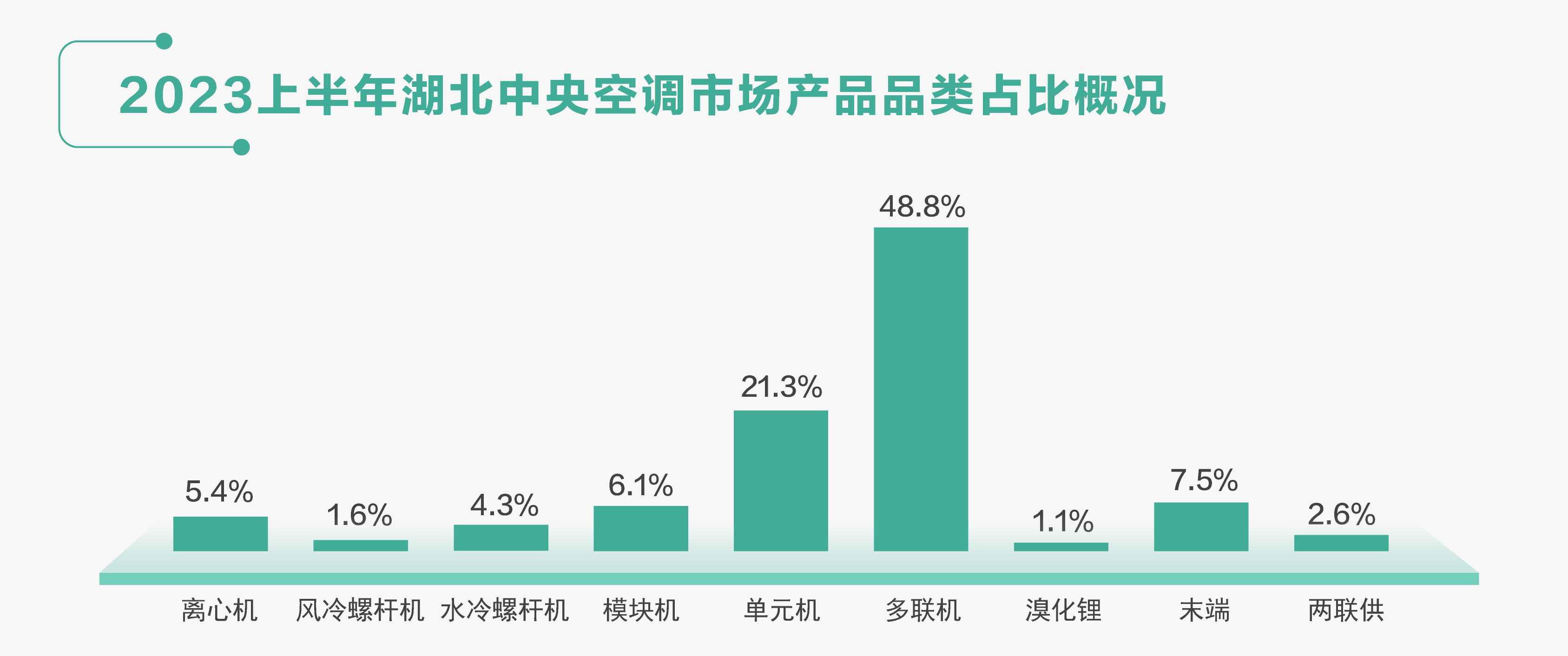產品方面,湖北中央空調市場前五名為:多聯機、單元機、末端、模塊機、離心機。多聯機組依然位居湖北市場第一大產品品類,占比為48.8%、單元機占比21.3%、末端7.5%、模塊機6.1%、離心機5.4%。