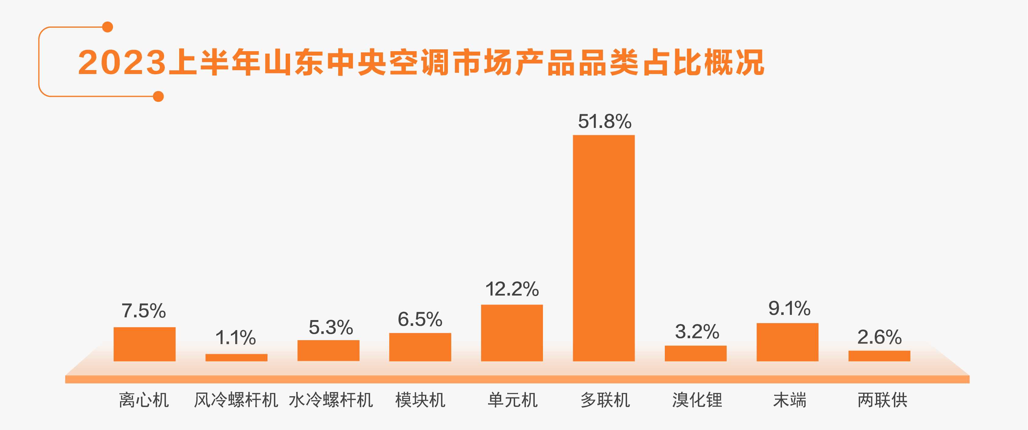 在2023上半年中,以多聯機為代表的氟系統占據51.8%的市場主導份額;其次,單元機的市場占比達12.2%;冷水機方面,離心機、模塊機產品市場占有率較為接近,分別為7.5%、6.5%。