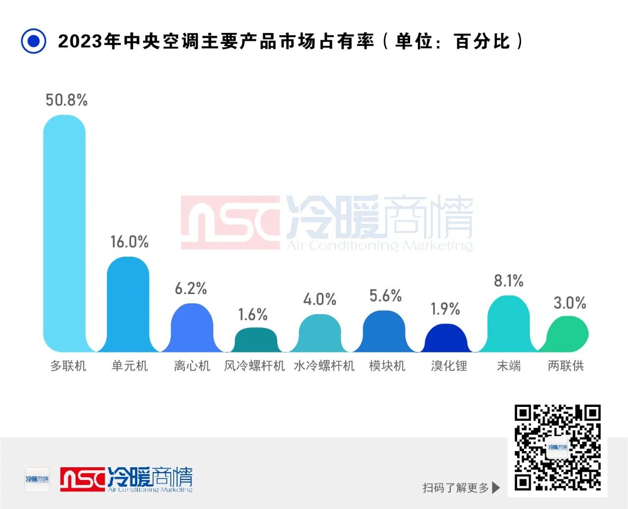 2023年,多聯(lián)機(jī)以50.8%的比例占據(jù)榜首,緊跟其后的是單元機(jī),占有率為16%。
