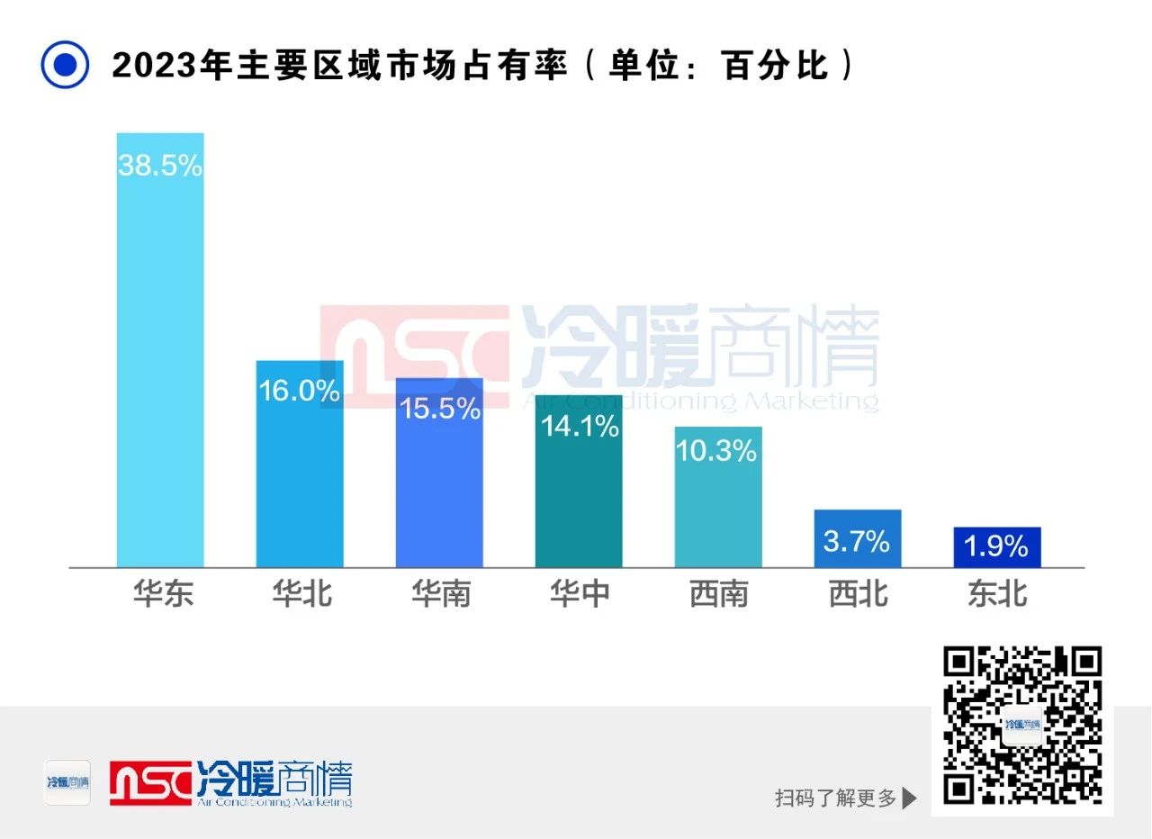 華東、華北市場(chǎng)占有率依次是38.5%、16.0%,值得一提的是這兩大區(qū)域市場(chǎng)2023年上半年均實(shí)現(xiàn)兩位數(shù)增長,但下半年因市場(chǎng)大環(huán)境因素影響,表現(xiàn)平平。