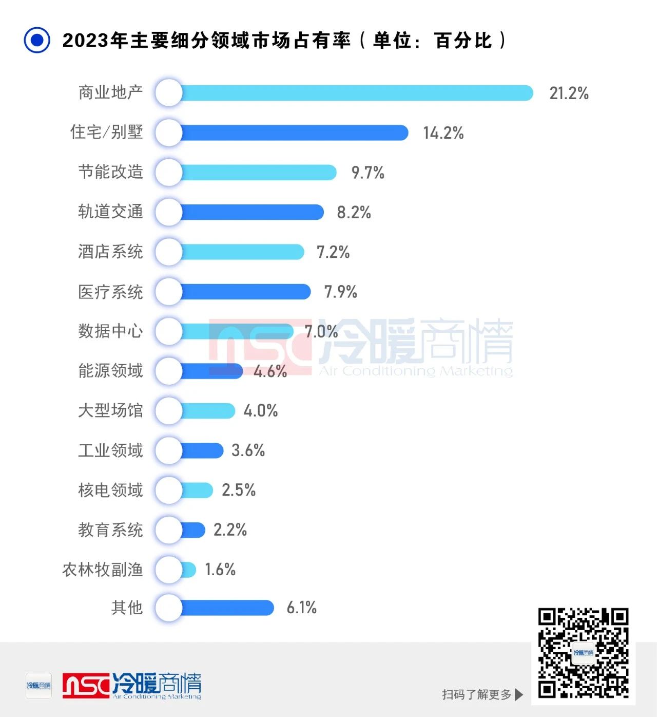 從數(shù)據(jù)來看,中央空調(diào)在商業(yè)地產(chǎn)領(lǐng)域的應(yīng)用,依然穩(wěn)定保持在20%以上。住宅/別墅領(lǐng)域排列第二,消費(fèi)者需求更加多元化。在政策的大力推動(dòng)下,越來越多的企業(yè)開始進(jìn)入或加大對(duì)新能源汽車、光伏、鋰電池以及眾多上游新能源原材料加工企業(yè)等領(lǐng)域的投入和開拓。核電、教育系統(tǒng)、農(nóng)林牧漁等其他領(lǐng)域同樣得到越來越多企業(yè)的關(guān)注。